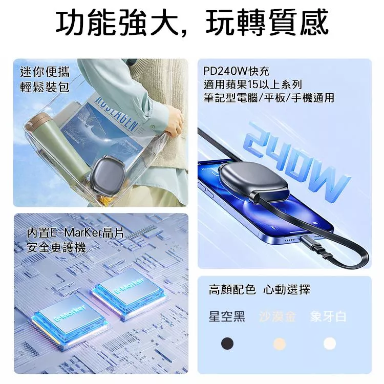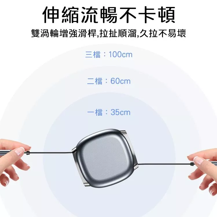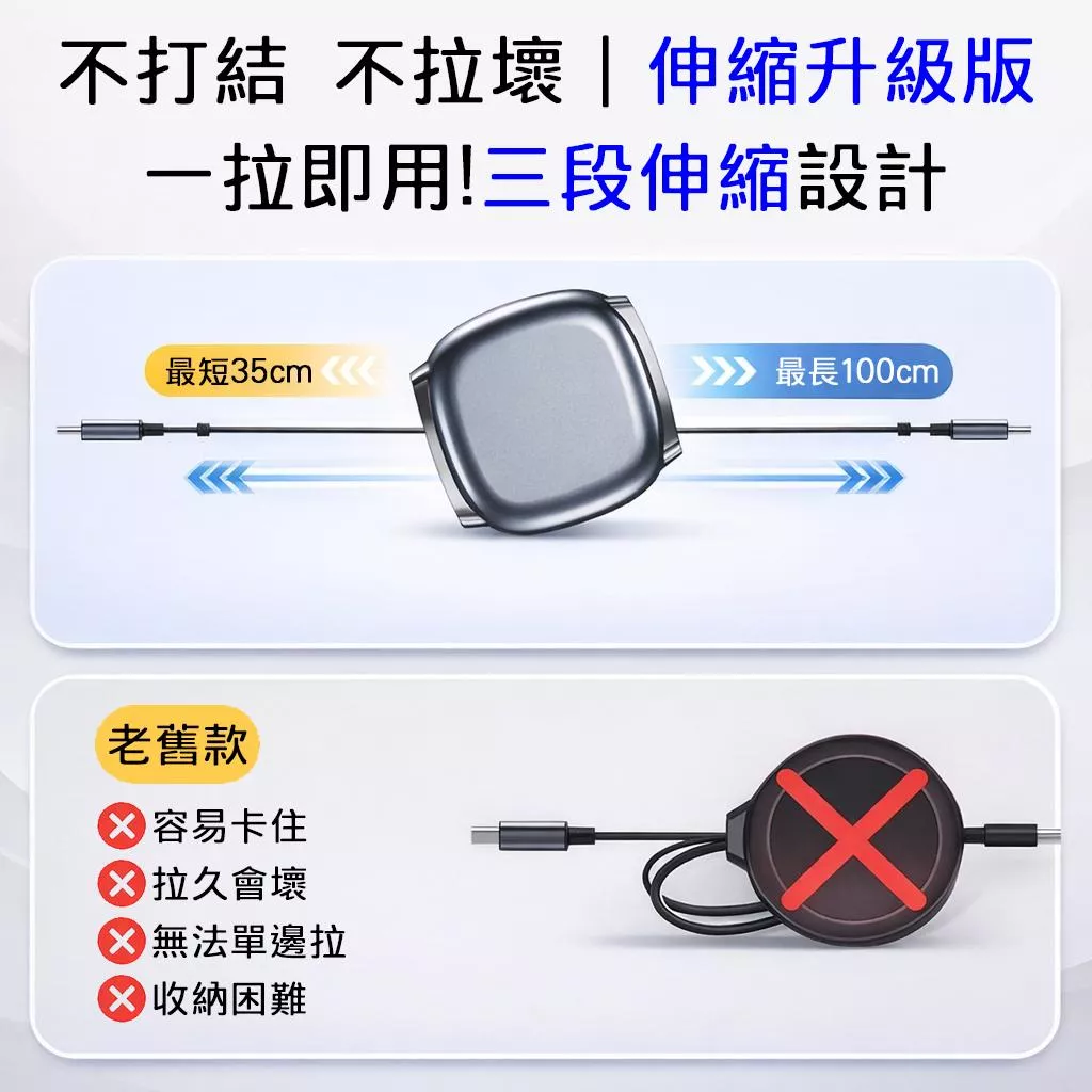 三段式伸縮設計,輕鬆收納不打結,支援240W PD快充,手機、平板與筆電皆適用。迷你體積方便攜帶,隨拉隨用,充電更快速穩定。