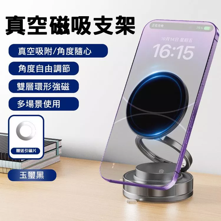 全新升級真空磁吸手機支架,採用N52強磁設計與360°旋轉底座,支援MagSafe與附贈引磁片,99%手機皆可使用。三軸多角度調整與折疊收納設計,穩固耐用、視角自由調整,是車用導航與日常使用的最佳手機支架。